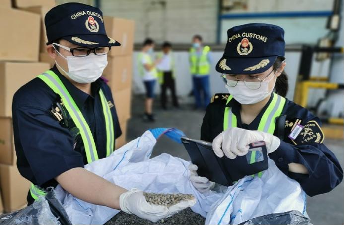 That day, the Customs House intercepted an inbound consignment declared as “reclaimed PE grains”, which smelled pungent and had uneven color, and finally identified them to be polyvinyl scraps or leftovers that belong to the solid waste prohibited from importation. By now, this batch of illegal waste is under anti-smuggling investigation.