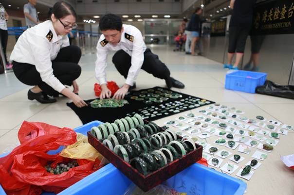 On that afternoon, customs officers seized 676 pieces of jade articles like bracelets, pendants from two luggage carried by passengers surnamed Wu and Luo. On that night, another 98 pieces of jade articles and raw gemstones were seized from another incoming passenger.