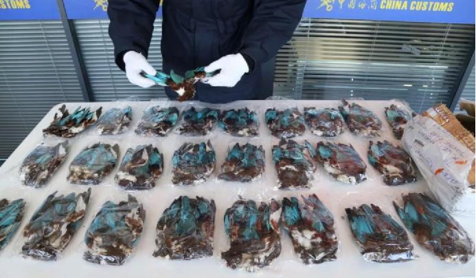 Recently, Zhengzhou Customs seized 25 feather skins of kingfishers in an inbound postal parcel from India at Zhengzhou Post Office.
