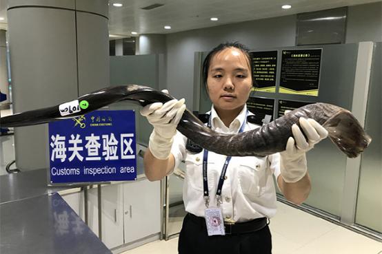 That afternoon, at the entry hall of Guiyang International Airport, 10 flight-passengers’ luggage were all found abnormal through X-ray machine. By unpacking inspection, the Customs officers seized the 11 suspected addax horns in the luggage. The passengers told that those horns were bought overseas by them to be made into musical instruments.