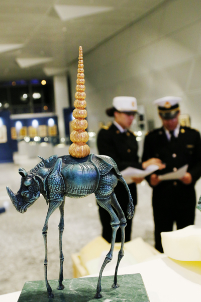 Dalian Customs officers were inspecting art treasures in exhibition.