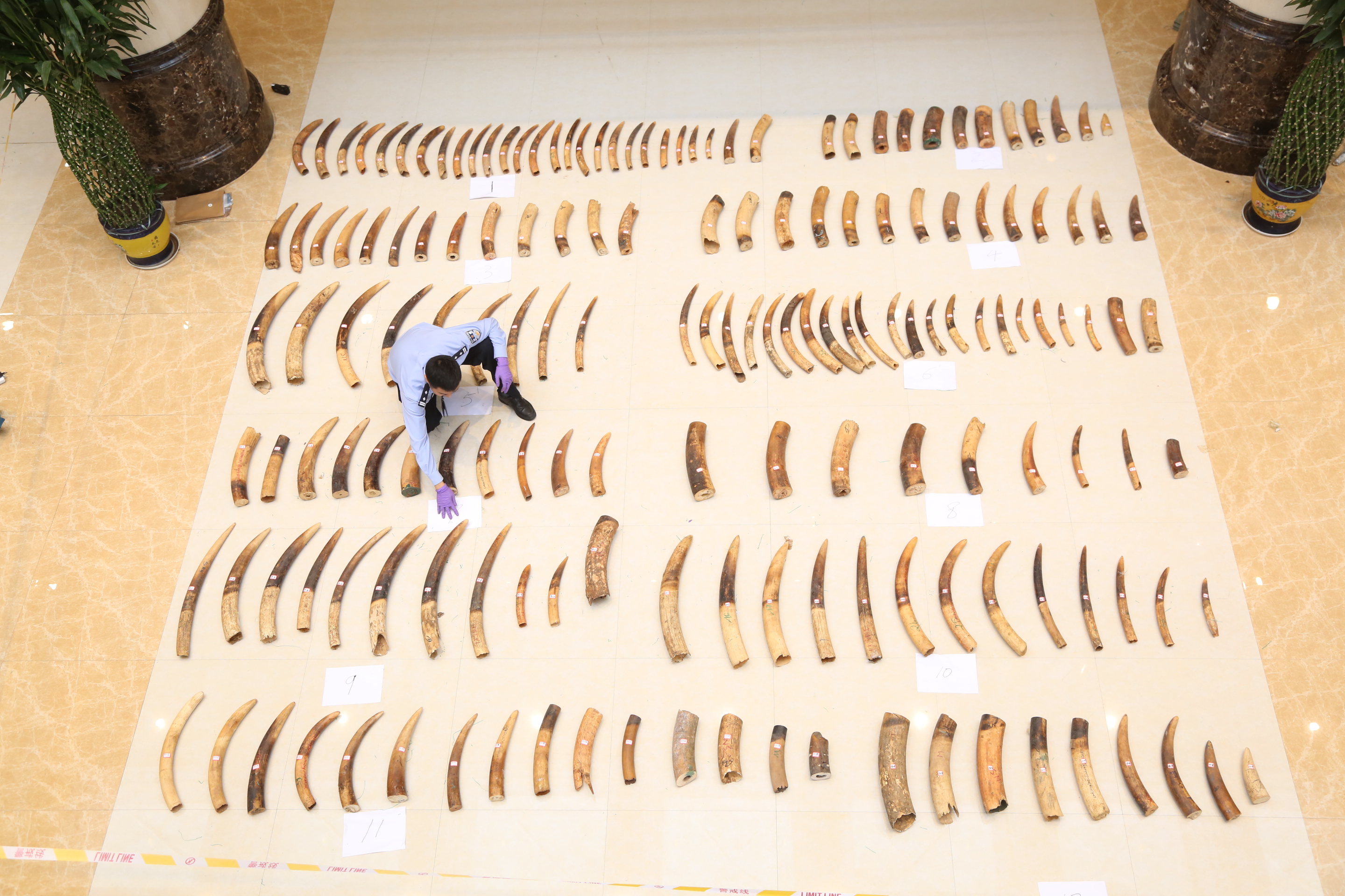Customs officers counting the seized raw ivories