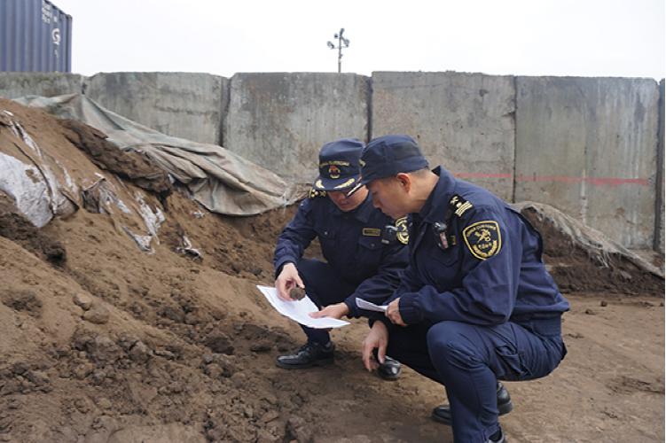 Customs officers inspect the solid waste in the field.
