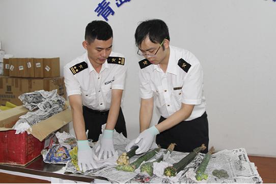 On August 8, Customs officers stationed in Qingdao Post Office intercepted a suspicious parcel from Japan and, by unpacking inspection, seized 7 live plants of the cactus family. The 7 plants were finally identified to be 5 grafted lophophora, 1 grafted Coryphantha elephantidens and 1 endangered Pelecyphora aselliformis, all of them reproducible and potential to spread plant diseases.