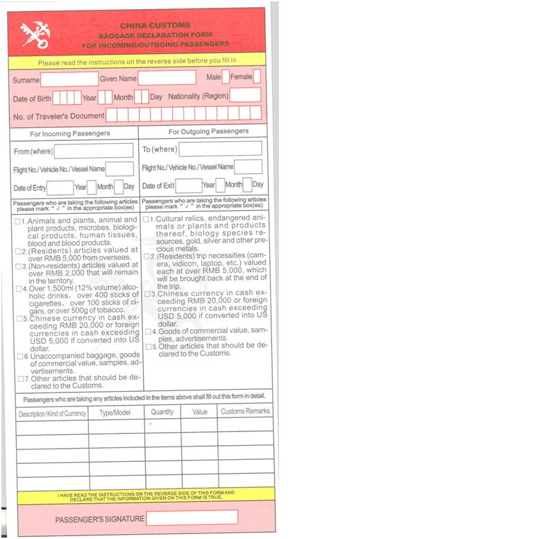 The China Customs Baggage Declaration Form for Incoming/Outgoing Passengers (hereinafter referred to as the “Declaration Form”) is composed of three parts, i.e. basic information of passengers, declaration items of passengers and detailed list of declaration items. Passengers are required to fill in each box or tick in corresponding boxes. Passengers are also required to fill in the red-colored boxes personally. In filling out the form, please follow the instructions below: