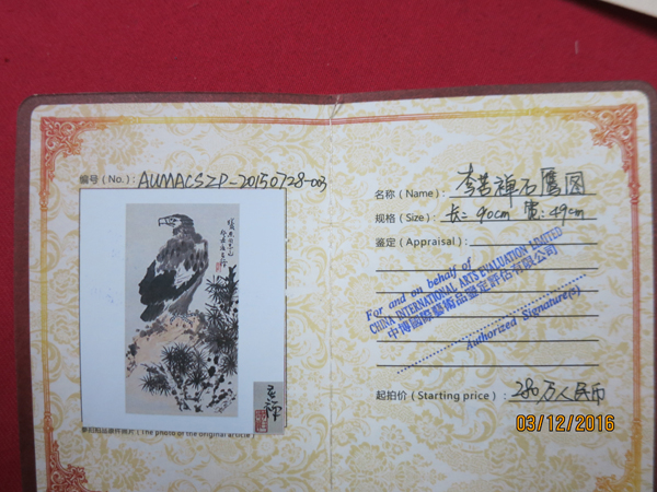 Auction Certificate issued by China International Arts Evaluation Company Limited for the painting