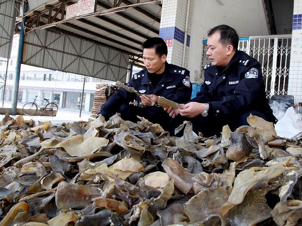 Those turtle pieces were captured on intelligence on the common border of Yangchun City and Luoding City. At that time, one truck suspected of smuggling carried animal and plant-made products including imported dried shark fin, turtle pieces, maca (lepidium meyenii walp), moringa seeds and American ginseng, weighing 17 tons in total. Therein, there were over 2500 Ganges soft-shell turtle pieces weighing 120kg.