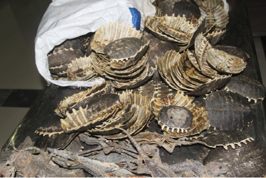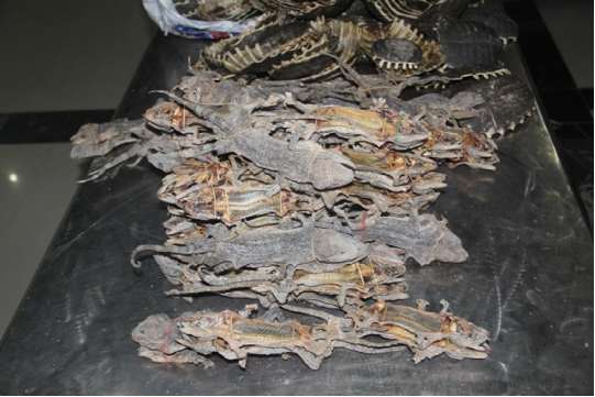 That day, Mengla Customs officers inspected one refrigerating vehicle coming from Laos and found 34 kilograms of wild turtle shells and 100 dried giant geckos in the cab.