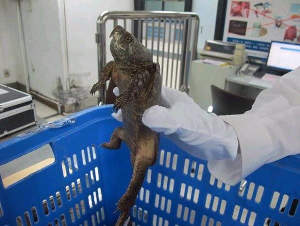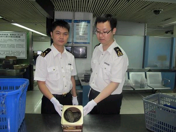 Officers of Shenzhen Customs District said they had seized seven live big-headed turtles in the luggage of an inward passenger entering through Luohu Port a few days ago. Customs officers said they found out in the inspection that the passenger had hidden three of the turtles in a moon cake box and the other four in the file holders in his/her carry on bag.