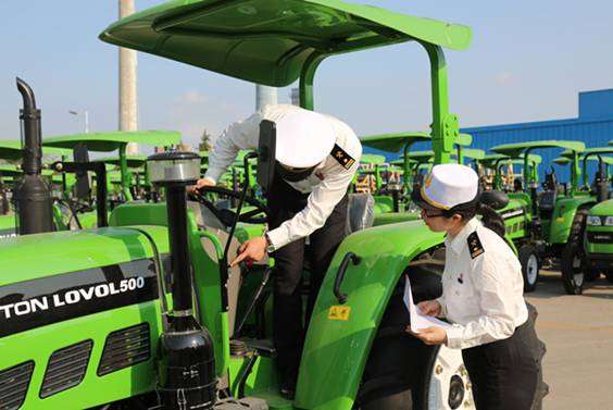 On the freight yard of Foton Lovol Heavy Industries Co., 500 green tractors were arranged in order and Jinan Customs officers were inspecting them for their export to African Mali by the "Maritime Silk Road" ship.