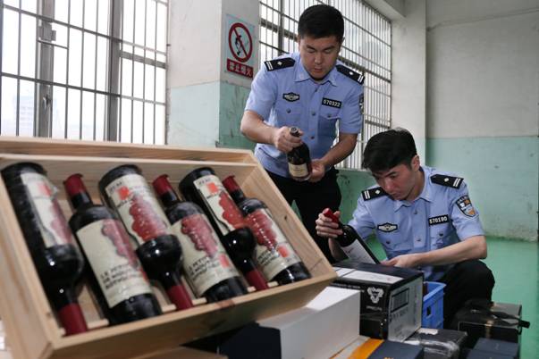 Customs anti-smuggling officers were inspecting the smuggled wine.