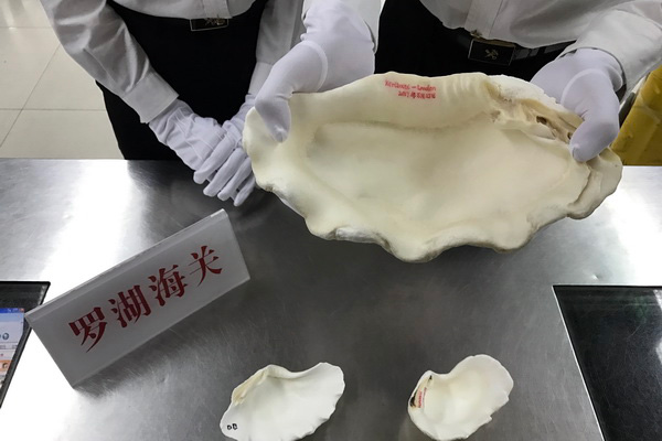 On July 21, Luohu Customs of Shenzhen Customs District intercepted an inward passenger with 3 white shells, the biggest one weighing nearly 4 kilograms. They were identified as being China’s first-class protected animals.