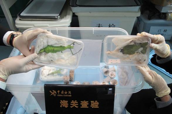 On March 22, Hangzhou Customs seized live animals from within an inbound mail declared as candies, including live centipedes, mantises and lizards.