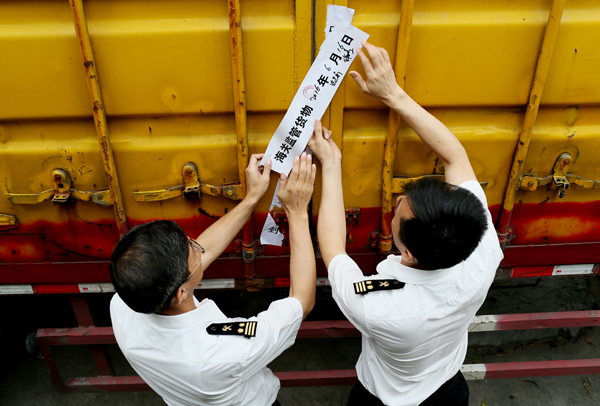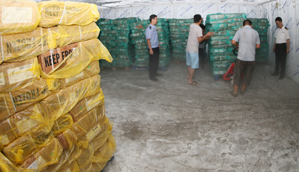 Customs officers were sealing the truck carrying the seized frozen foods.