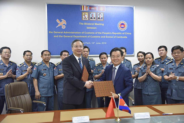 Vice Minister Hu Wei signs a cooperation document with Mr. Kun Nhem, Director General of the General Department of Customs and Excise of Cambodia.