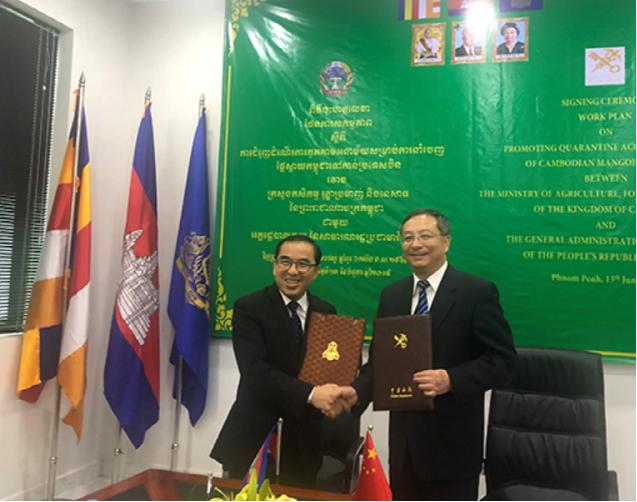 Vice Minister Hu Wei held bilateral meetings respectively with Mr. Veng Sakhon, Minister of the Ministry of Agriculture, Forestry and Fisheries (MAFF), Mr. Kun Nhem, Director General of the General Department of Customs and Excise and Mr. Mam Bunheng, Minister of the Ministry of Health of Cambodia, during which they exchanged in-depth views on enhancing cooperation in such areas as quarantine access for agricultural products and food, capacity building, anti-smuggling enforcement and, frontier health and quarantine between the two countries. Vice Minister Hu Wei also signed the Work Plan on Promoting Quarantine Access for Export of Cambodian Mangoes to China, the Minutes of the Bilateral Meeting, and the Cooperation Agreement on Frontier Health and Quarantine respectively with the above-mentioned officials of Cambodia.
