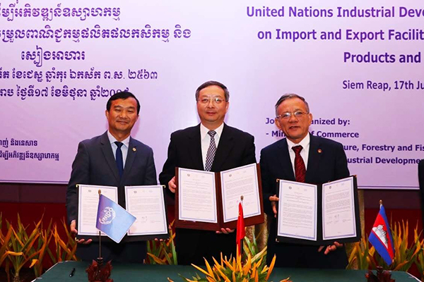 Vice Minister Hu Wei signs a tripartite cooperation document with representatives of United Nations Industrial Development Organization (UNIDO) and Secretary of State of the Ministry of Agriculture, Forestry and Fisheries of Cambodia.