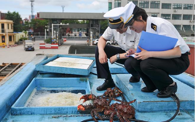 On July 25, when a consignment of king crabs from Russia was imported into the Dagang wharf at the port of Qingdao, local Customs officers immediately conducted clearance through a special green channel so that these live crabs were timely delivered onto the domestic market.