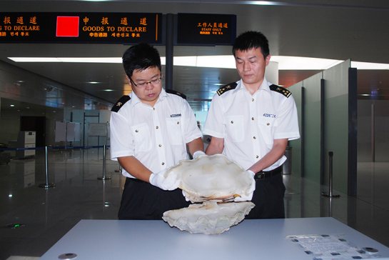 On August 9, in Qingdao Customs District, Yantai Customs House seized a giant clam carried inward by a passenger without declaration. The giant clam, weighing 17kg, 43cm long, 30cm wide and 24cm tall, was identified to belong to China's Class-1 Protected Animals.