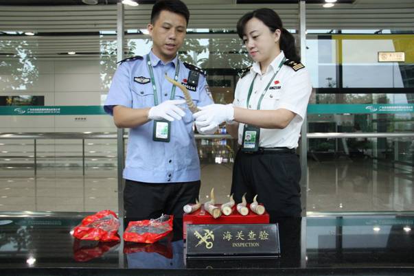 Recently, on the passenger control site at Jieyang Chaoshan Airport, Shantou Customs seized 6 pieces of saiga antelope horns, listed as China's Class-1 Protected Animals.