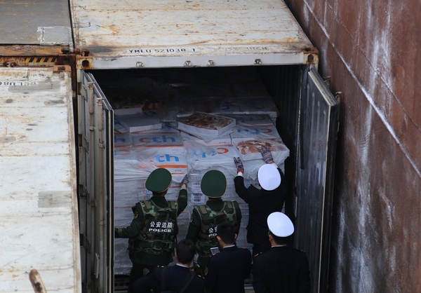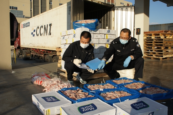 The smuggling ship, bypassing Customs areas, were transporting more than 800 tons of animal offal from Taiwan to Nantong for sale in the mainland. After intercepting the ship, Customs officers found the smuggled frozen food including pork tripe from the Netherlands, duck wings and duck feet from France, some of which are banned from import because of potential harm to human health.