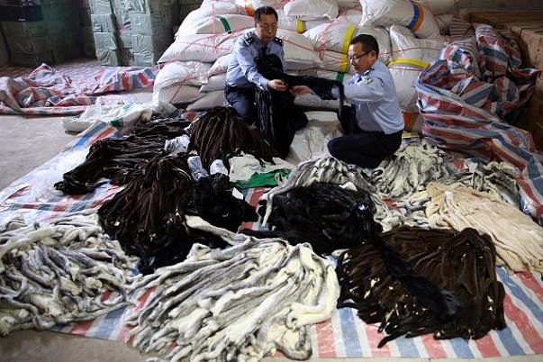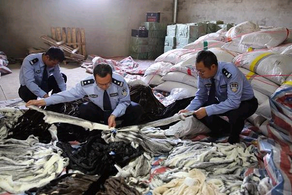 Anti-smuggling officers of Nanning Customs District were inspecting the might-be smuggled mink skins.