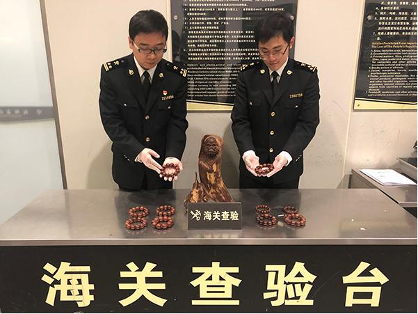 On November 26, Zhejiang Forestry Product Testing Station identified 11 pieces of endangered wood products, including 1 wood sculpture and 10 wood bracelets, earlier seized by Xiaoshan Airport Customs House subordinate to Hangzhou Customs District. Therein, the sculpture was made of red sandalwood (Latin: Pterocarpus santalinus), weighing 3.95 kilograms, and the 10 bracelets were made of yellow sandalwood (Latin: Dalbergia bariensis), weighing 0.59 kilogram.