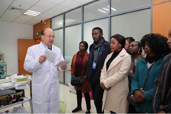 A worker of Suzhou Customs Testing Center introduces cosmetics sampling conditions to the Zambian trainees.