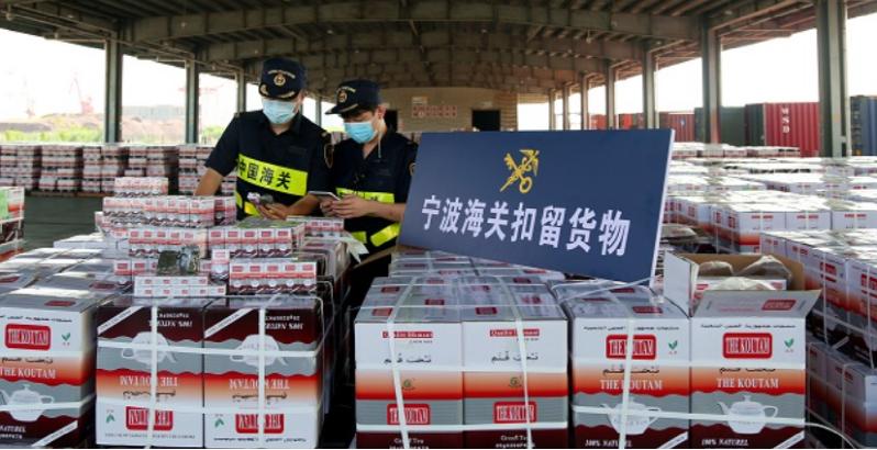 In Ningbo Customs District, an outbound batch of IPR-infringing green tea, totaling 69.6 tons in 2,784,000 packs, was detained at subordinate Daxie Customs House on June 2. These export tea, worth 2,215,600 yuan, marked the largest quantity and value of exporting counterfeits in Ningbo since the beginning of “Soaring Dragon 2020” campaign.