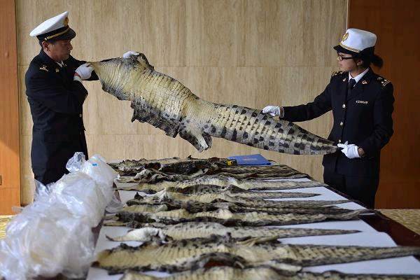 Customs officers were checking the tanned crocodile skins