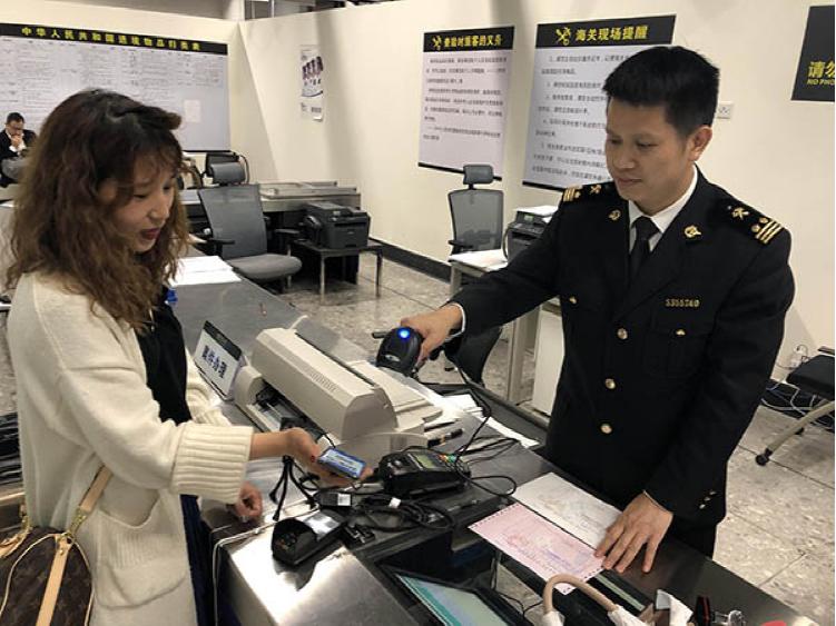 Recently, when clearing customs at West Kowloon Railway Station, Ms. Cao, a passenger returning from Hong Kong SAR, paid duties by mobile AliPay app for her handbag newly bought in Hong Kong, and the whole process finished just within 10 seconds.