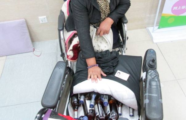On the evening of December 24, 2017, at the Gongbei port of entry, Customs officers intercepted one female passenger from Macao SAR, seizing 14 bottles of Martell Cordon Bleu brandy concealed in her wheelchair.