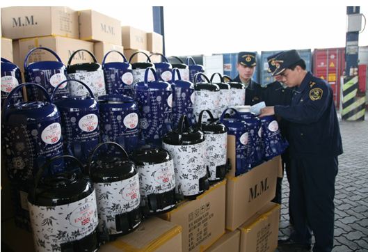 Officers of Nansha Customs House (affiliated to Guangzhou Customs District) said they had intercepted 6,012 thermoses that infringed upon the trademark rights of “THERMOS”.